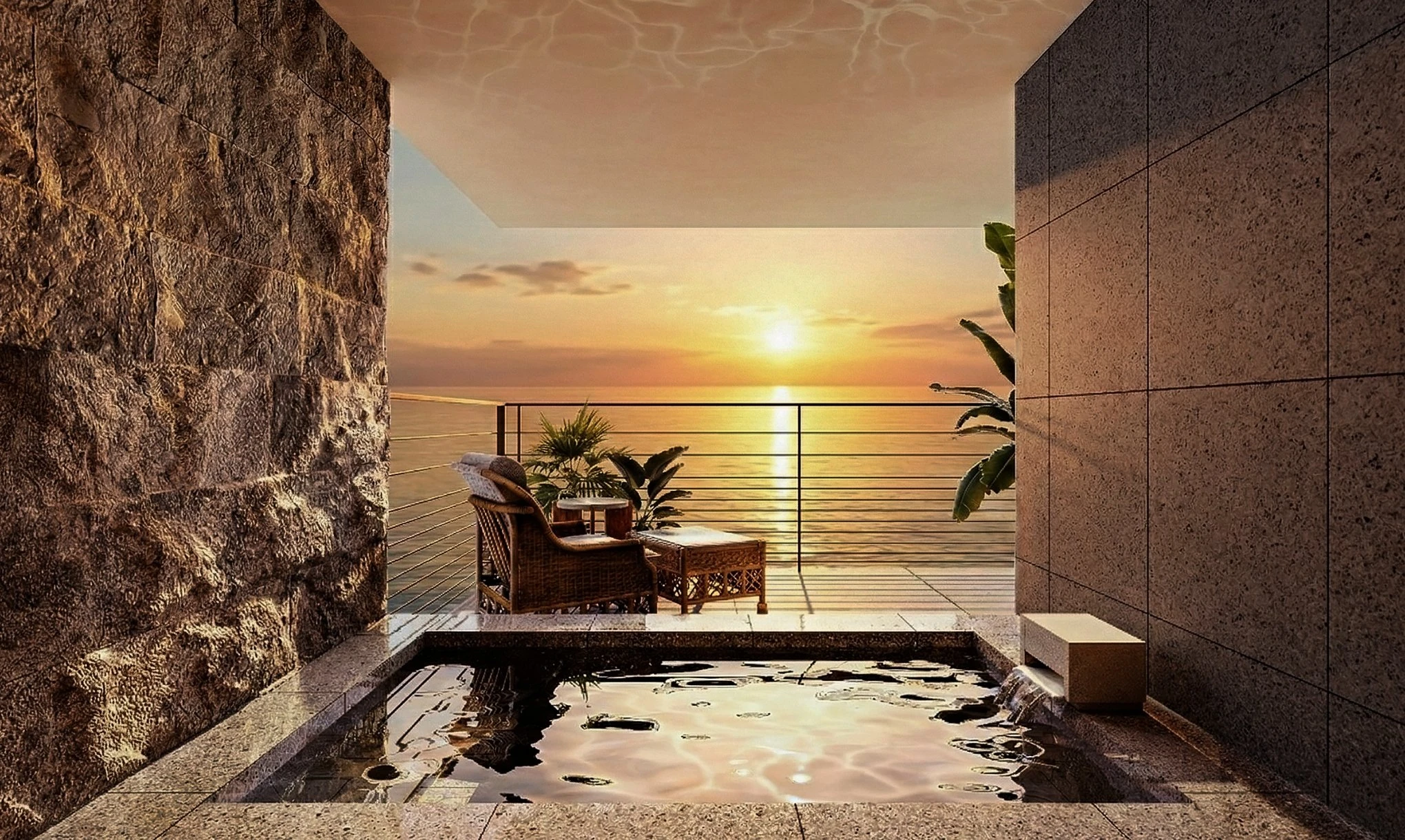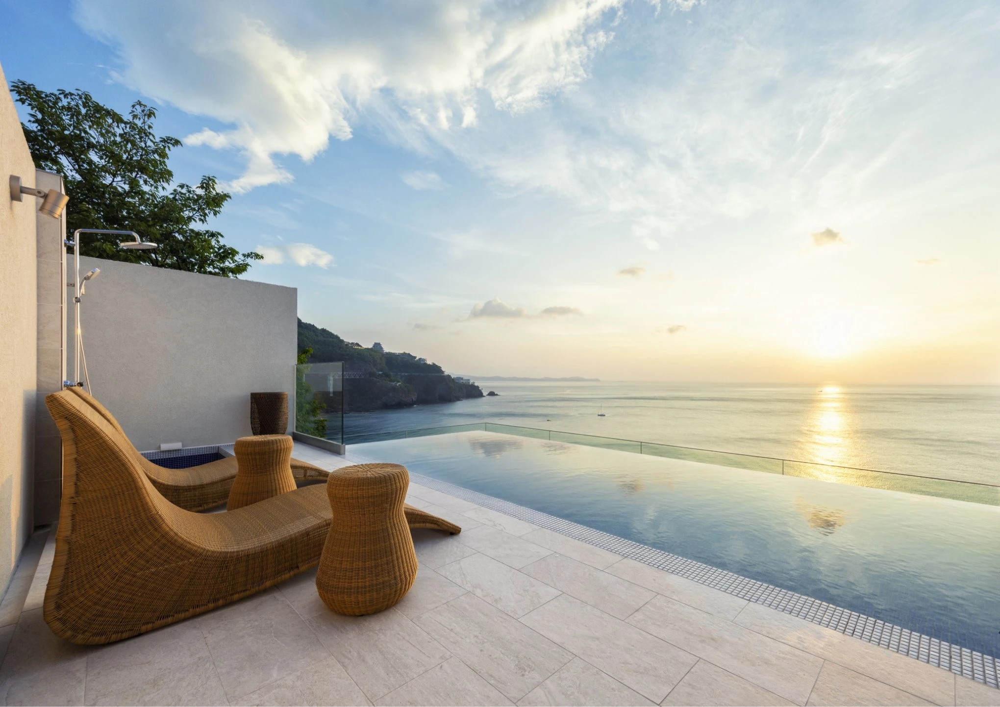 朝日浮かぶ水平線に向かって開けたプライベートインフィニティプール。気が向くままに過ごす優雅なひとときを。