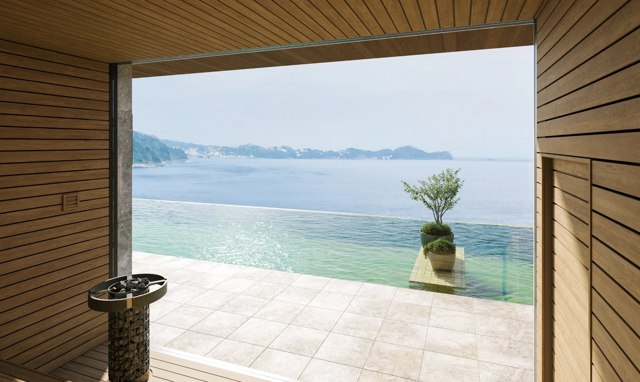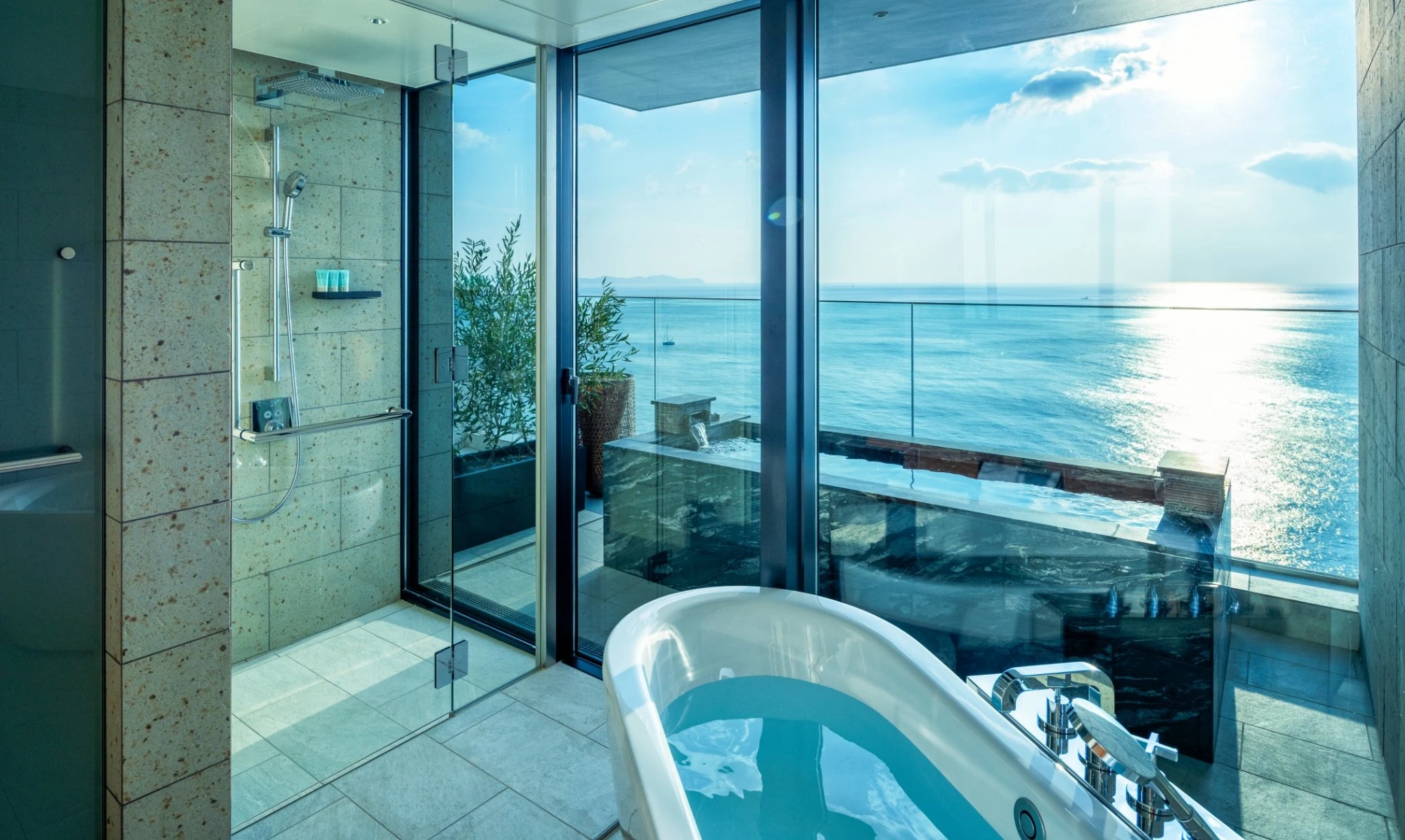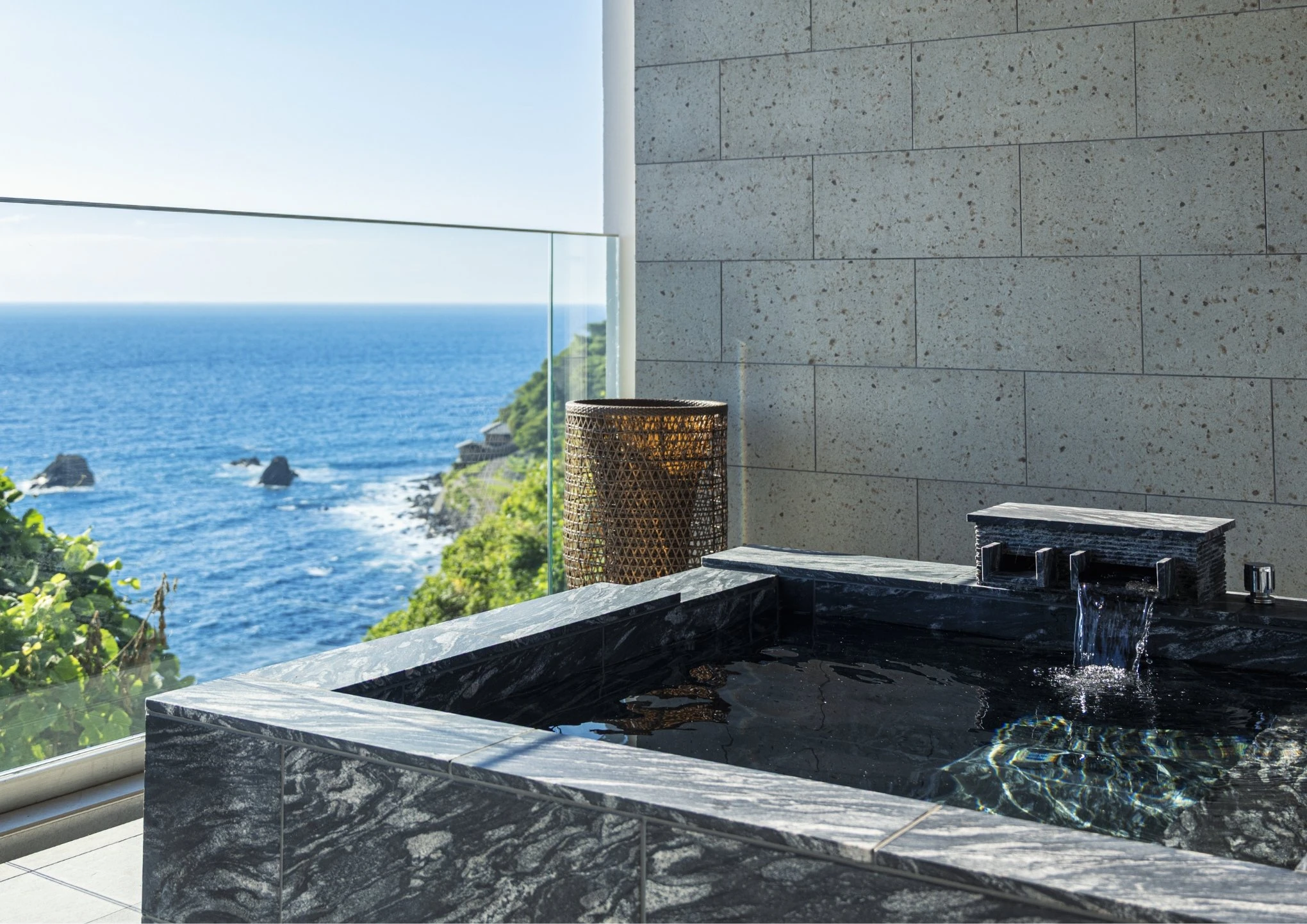 水平線と空の移ろいを一日中楽しめる半露天温泉。日々の疲れを流し、心のゆとりを生み出すリラックス空間。