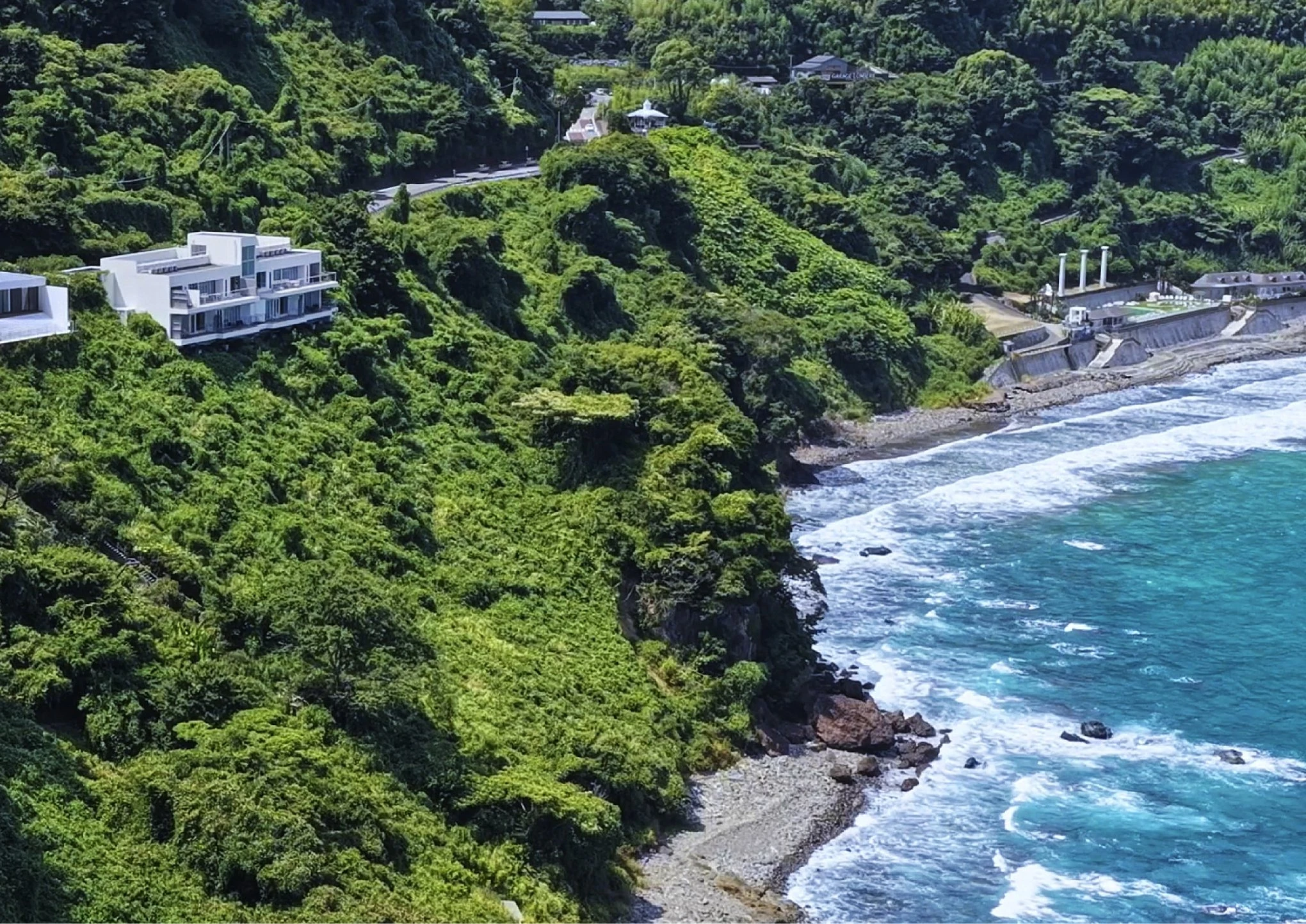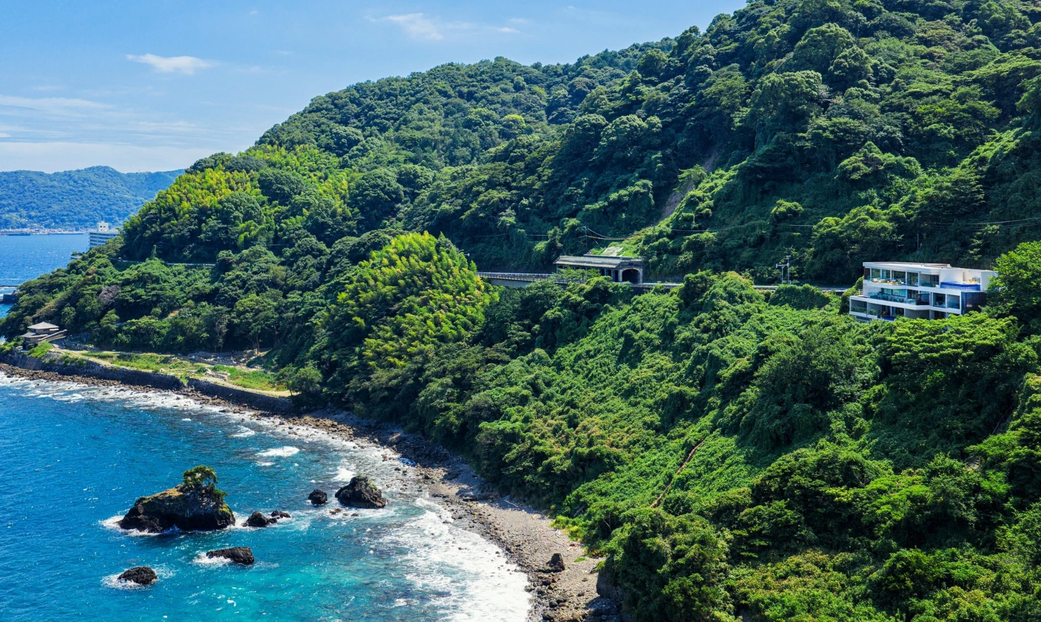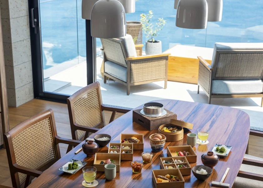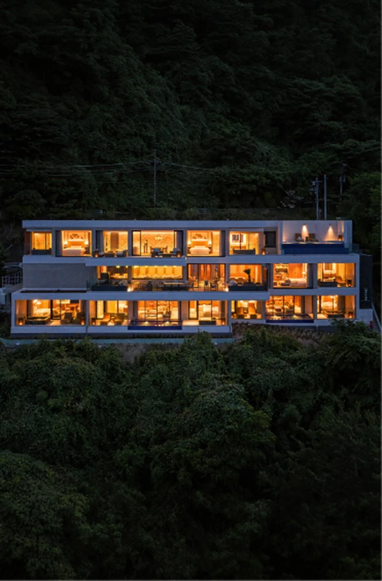 海を正面に臨む高台に佇む、わずか5室の本邸。波音と灯りが一日の移ろいを描き、風の匂いまでも心に触れる。