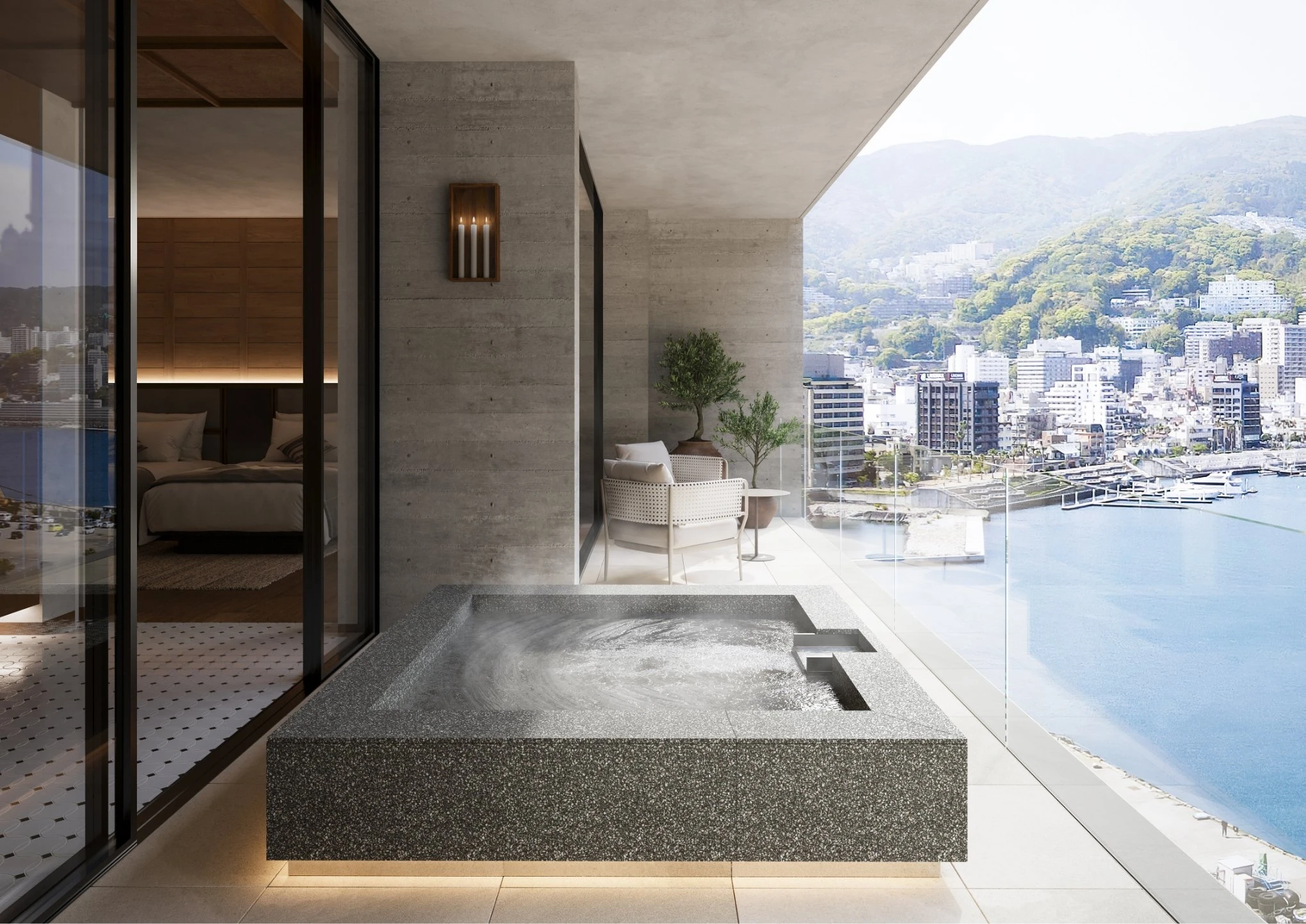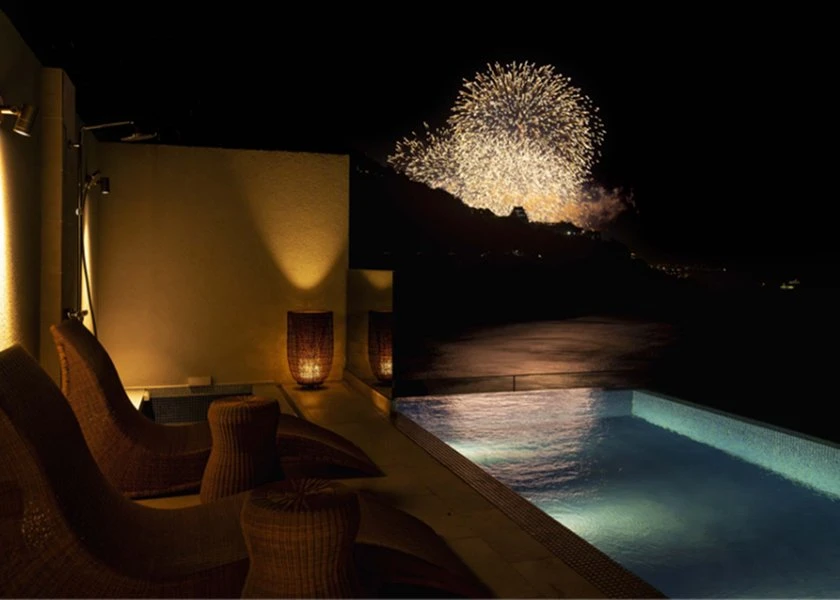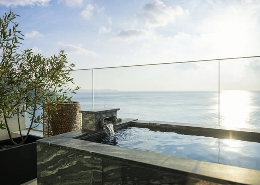 各寝室には専用の露天温泉が完備され、熱海の温泉を海景と共に愉しめる。