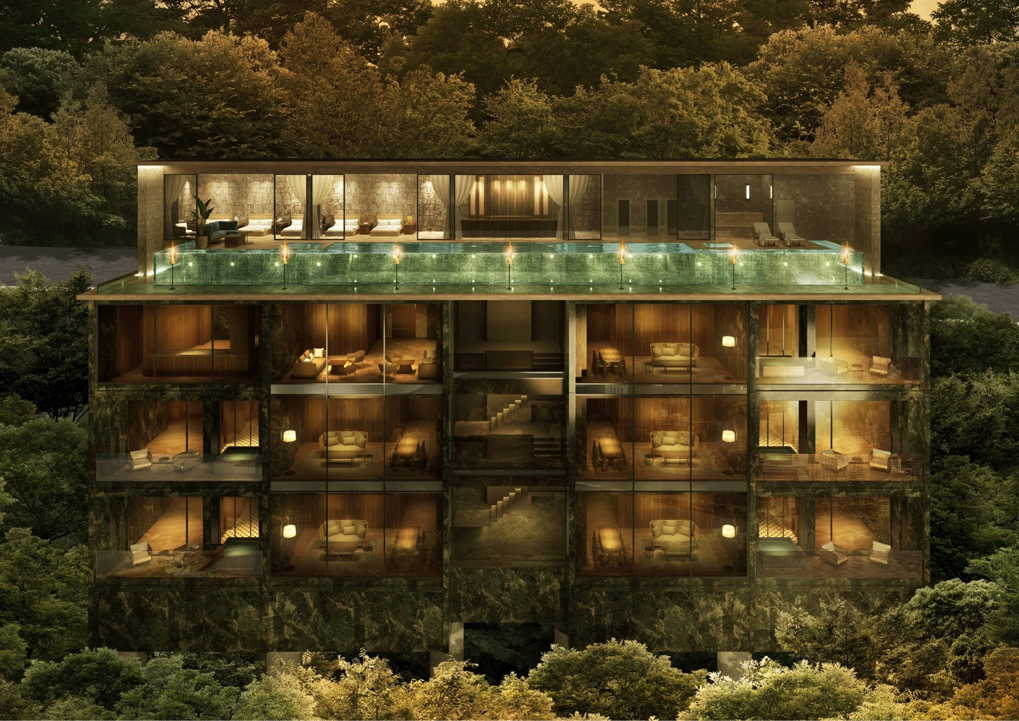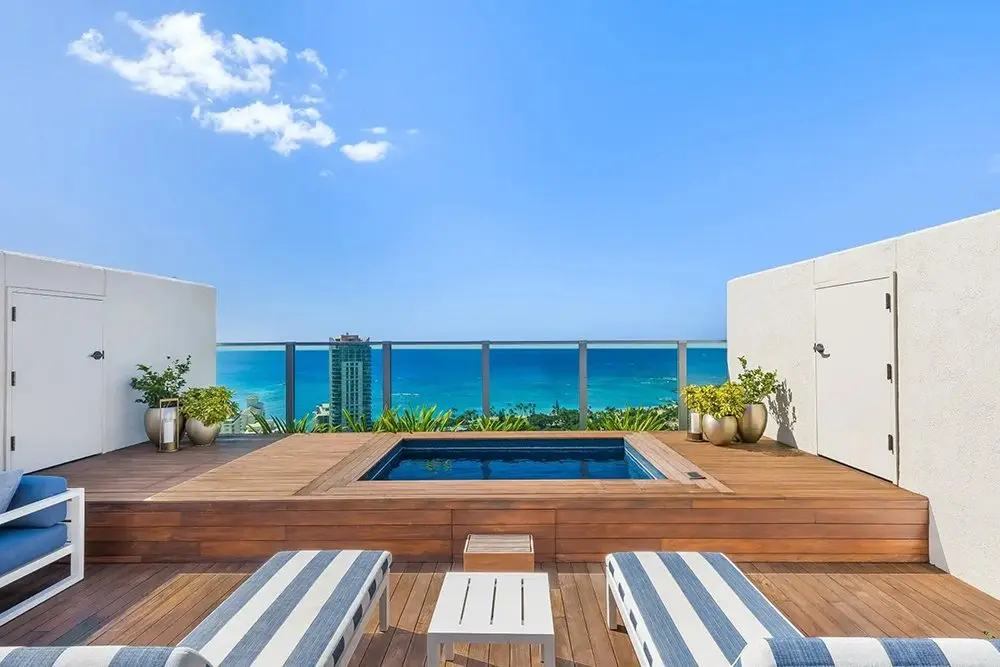 ルーフトップには、全長30メートル超えのインフィニティプール。プールサイドの専用カバナで特別な寛ぎを。
