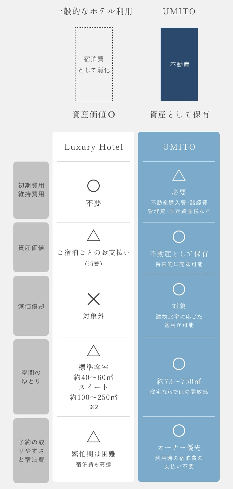 ご自身が使用しないときはUMITOがホテルとして貸し出し、収益が得られます。運営や建物の管理もメンテナンスも全てUMITOにお任せください。