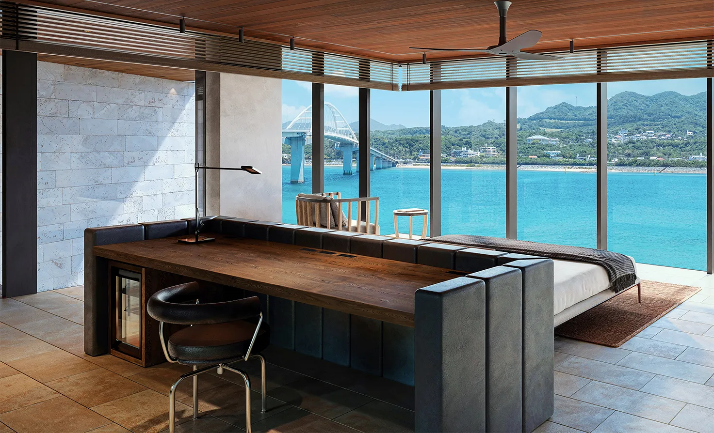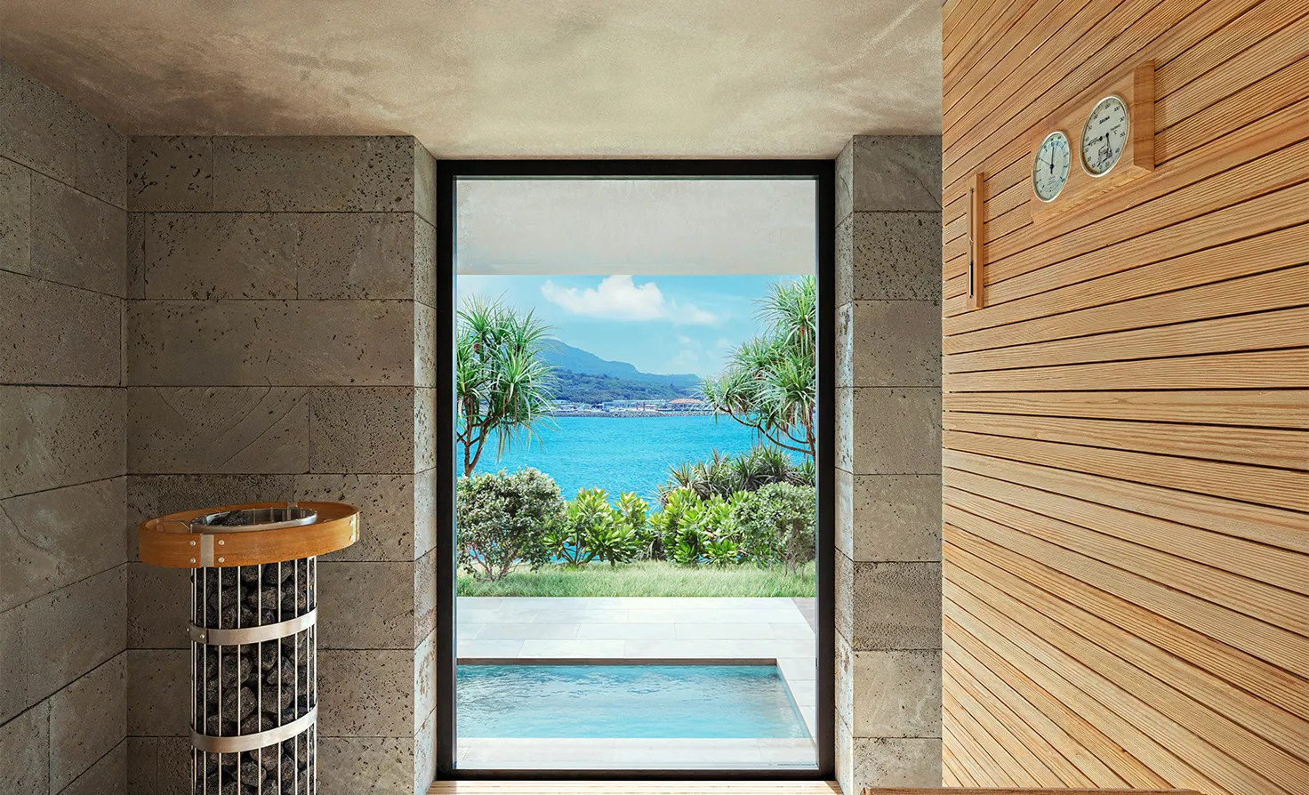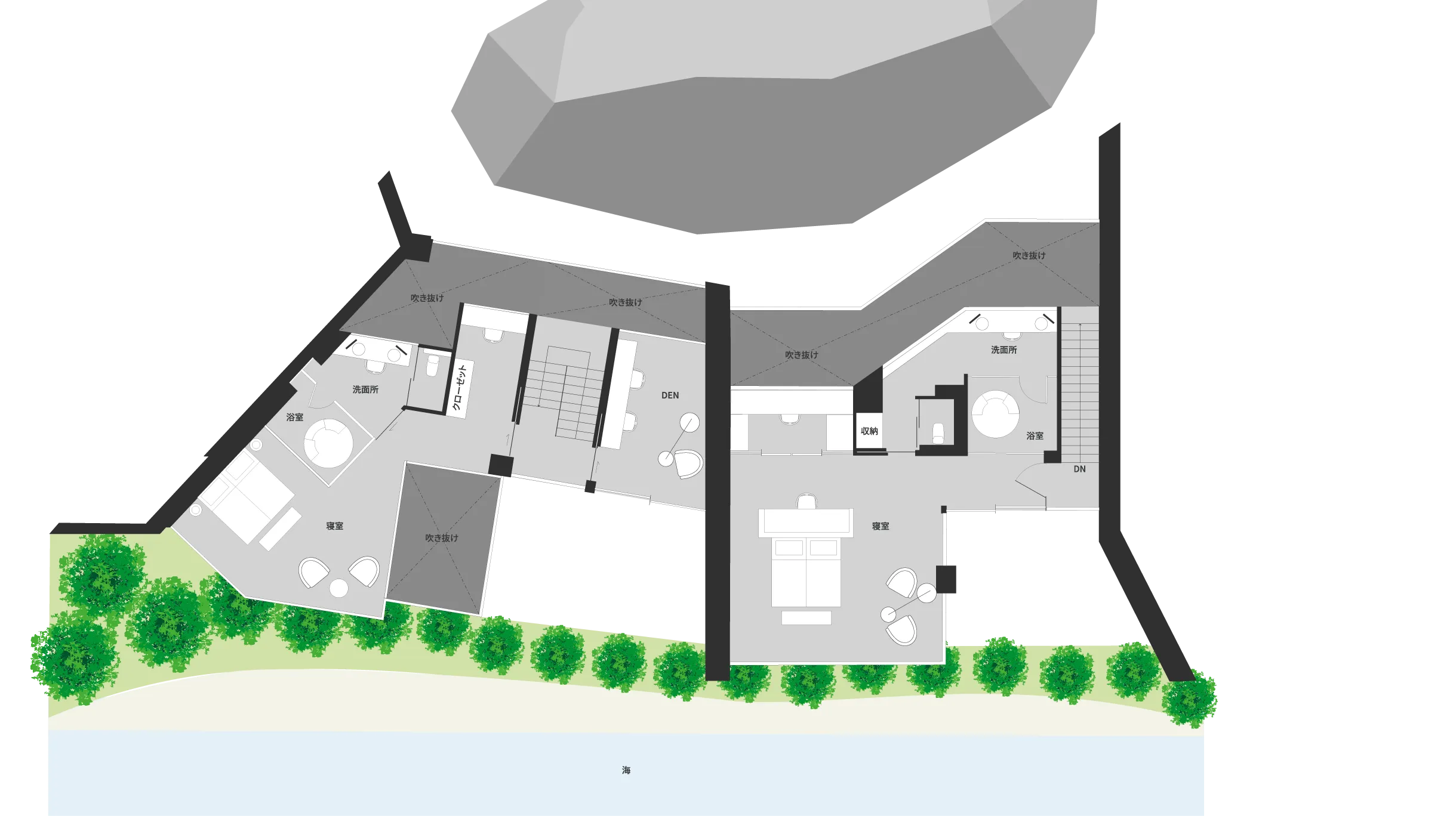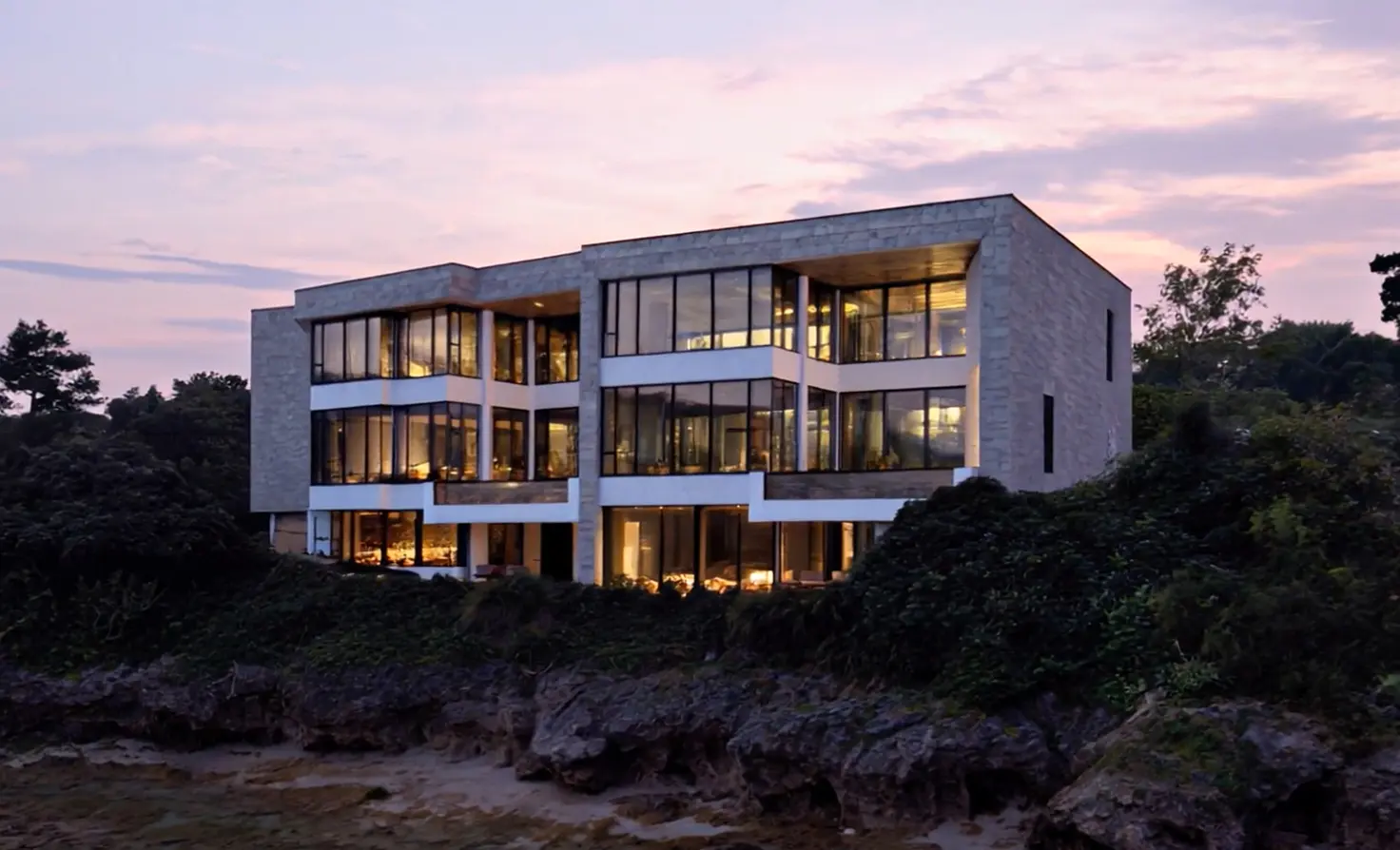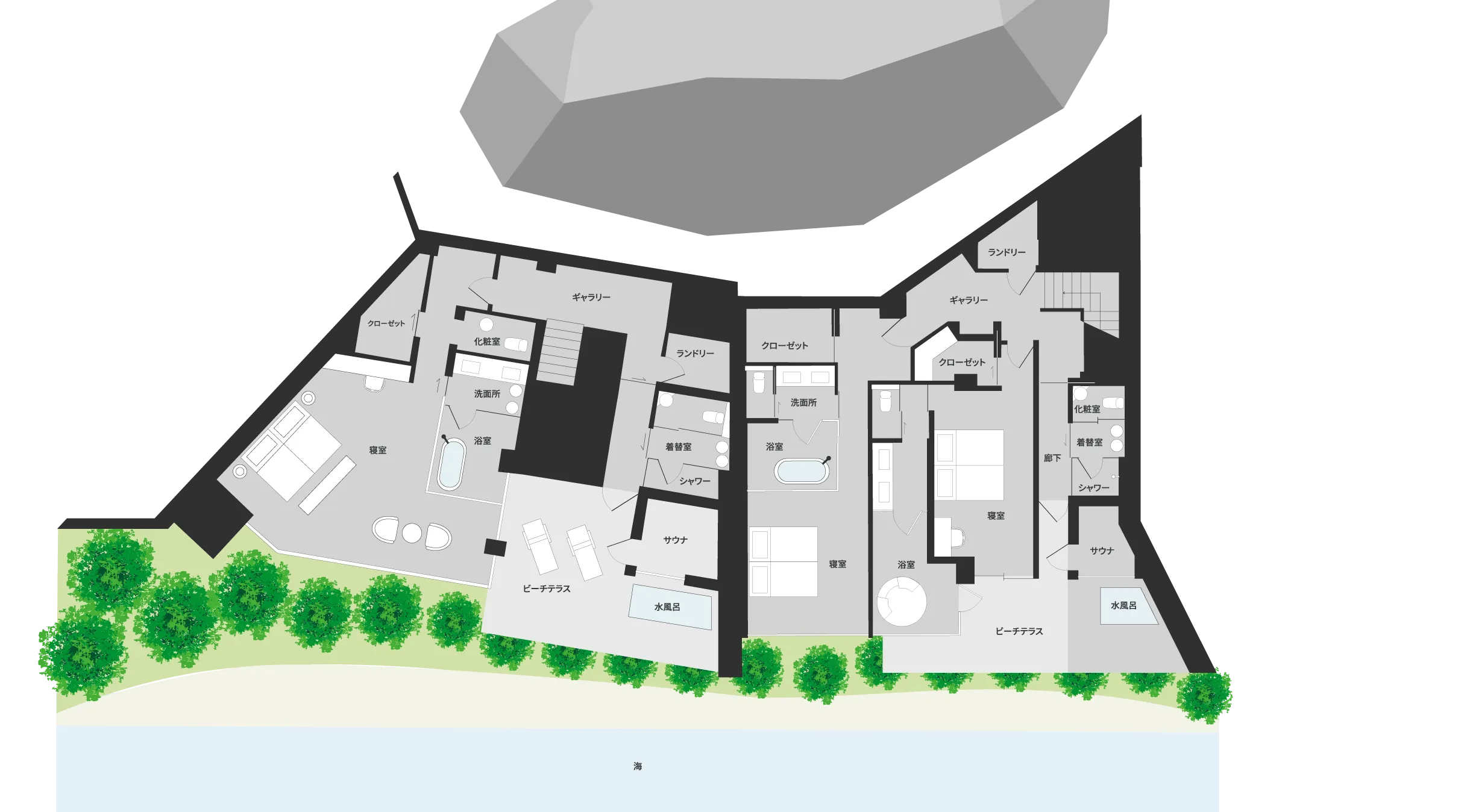グロットとは、「洞窟上の岩壁」の意味。文字通り崖と海のあいだに沈み込むように佇む建築。そこは、光と水面の揺らぎを抱き込み深い休息のための静かな時間を育む場所