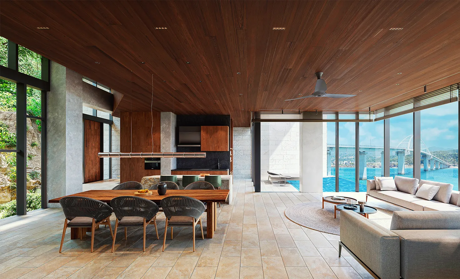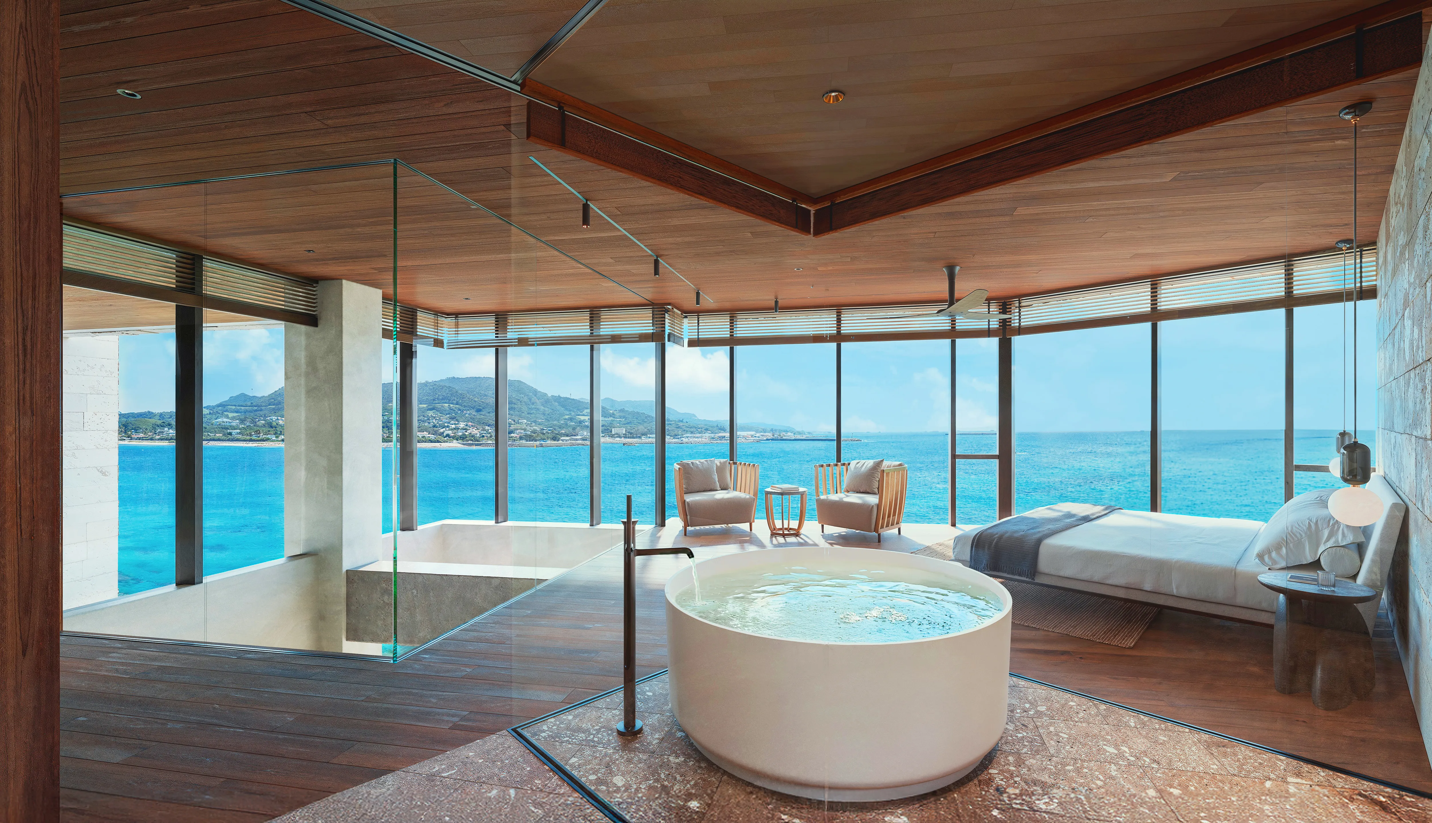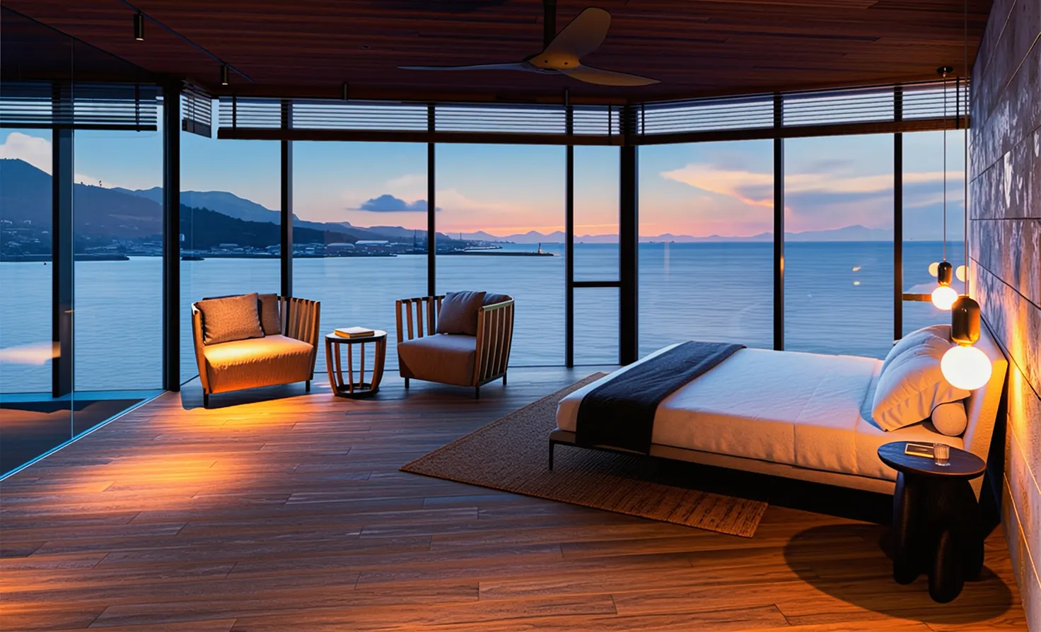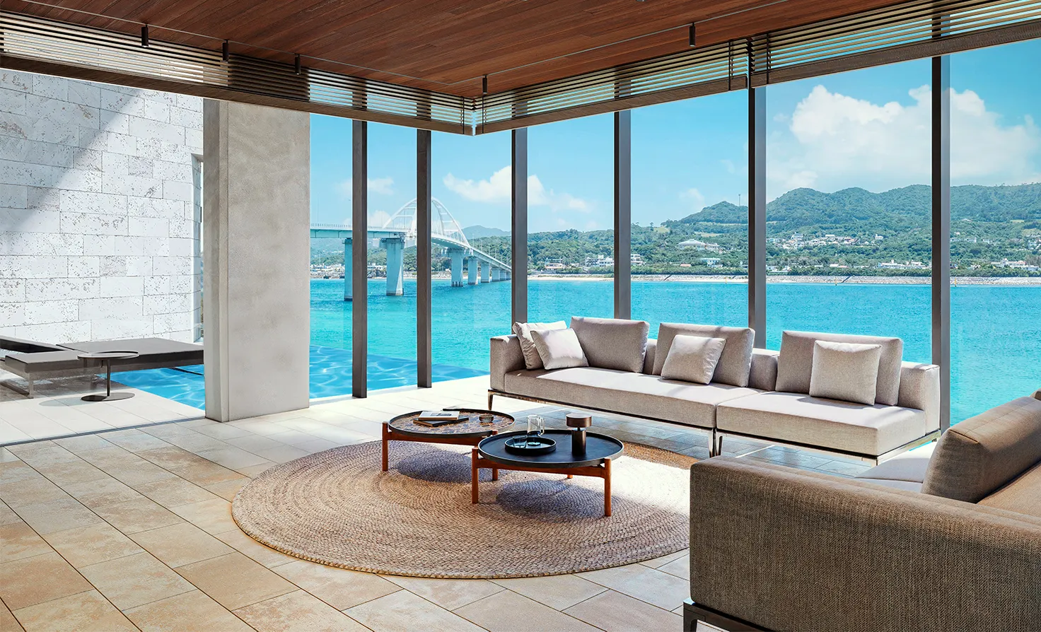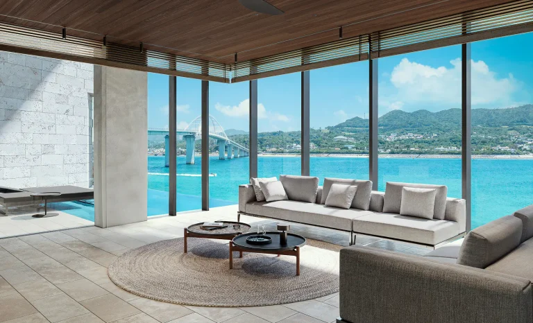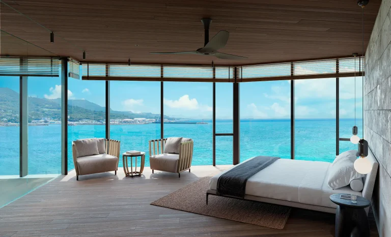 グロットとは、「洞窟上の岩壁」の意味。文字通り崖と海のあいだに沈み込むように佇む建築。そこは、光と水面の揺らぎを抱き込み深い休息のための静かな時間を育む場所