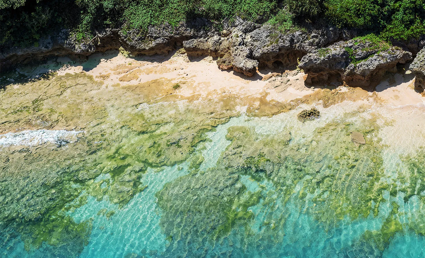 崖側にそびえる琉球石灰岩の力強い造形美と、