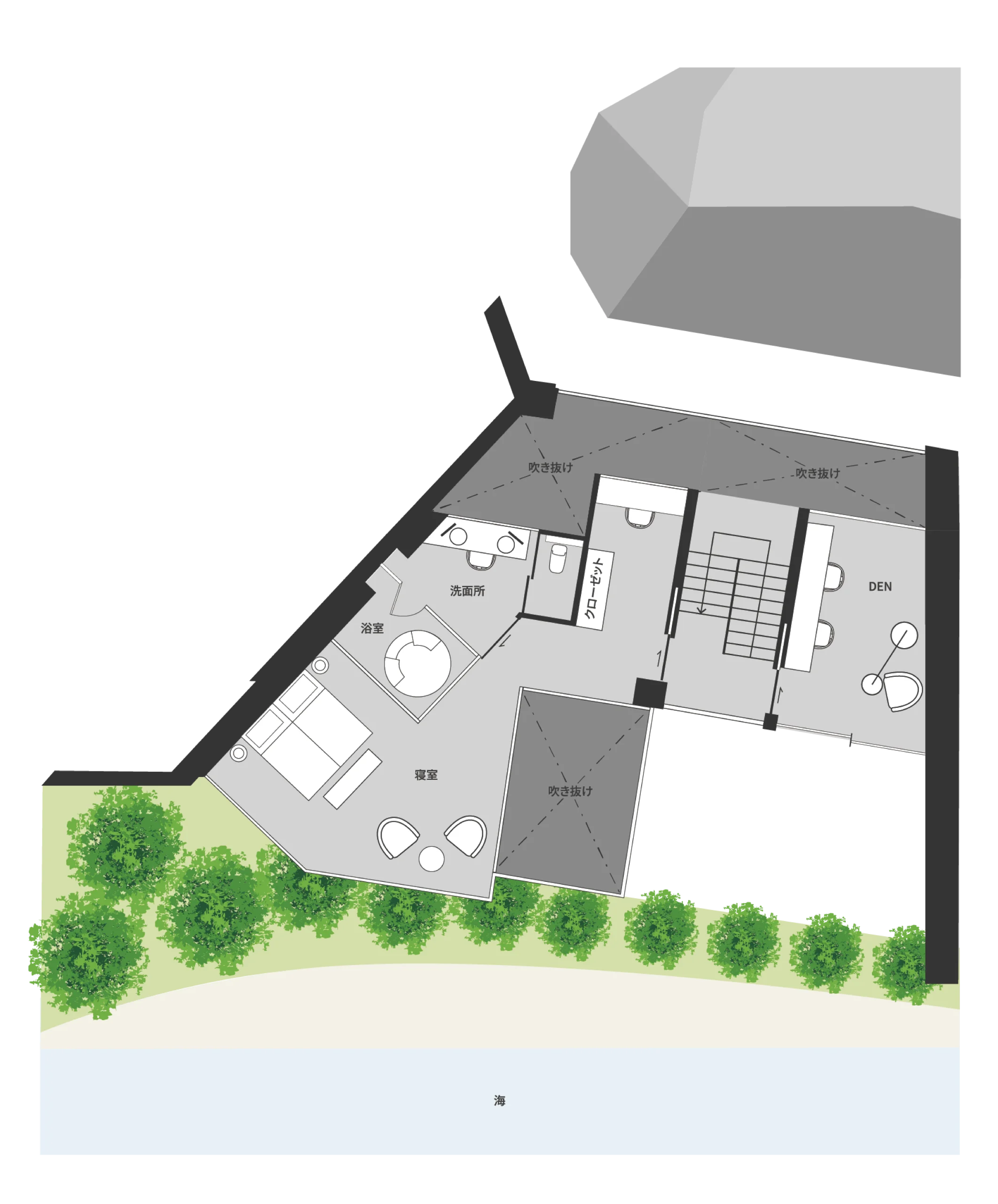 吹き抜けの向こうに崖と樹々の景色が広がり、